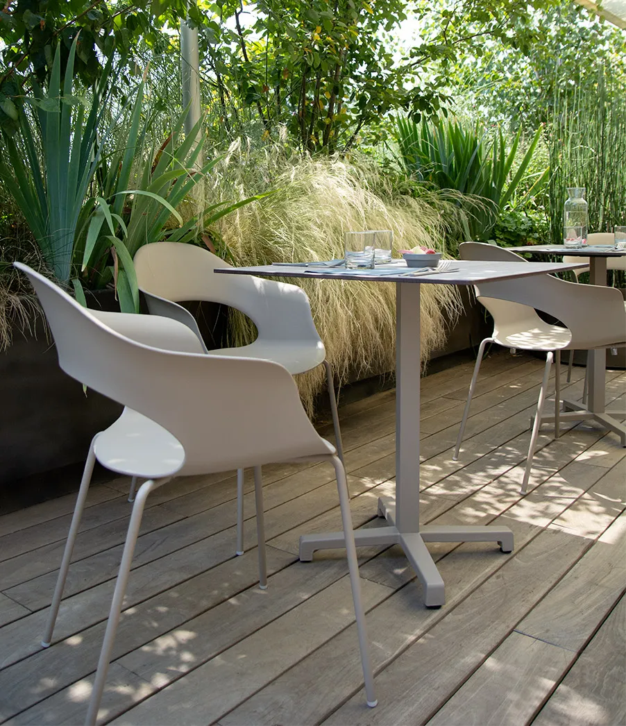 Base a croce in ghisa verniciata da mm. 550×550. Colonna quadrata da mm.50×50 in acciaio zincato e verniciato. Staffe di fissaggio al piano in fusione di ghisa. Con 4 piedini regolatori. Per uso interno/esterno