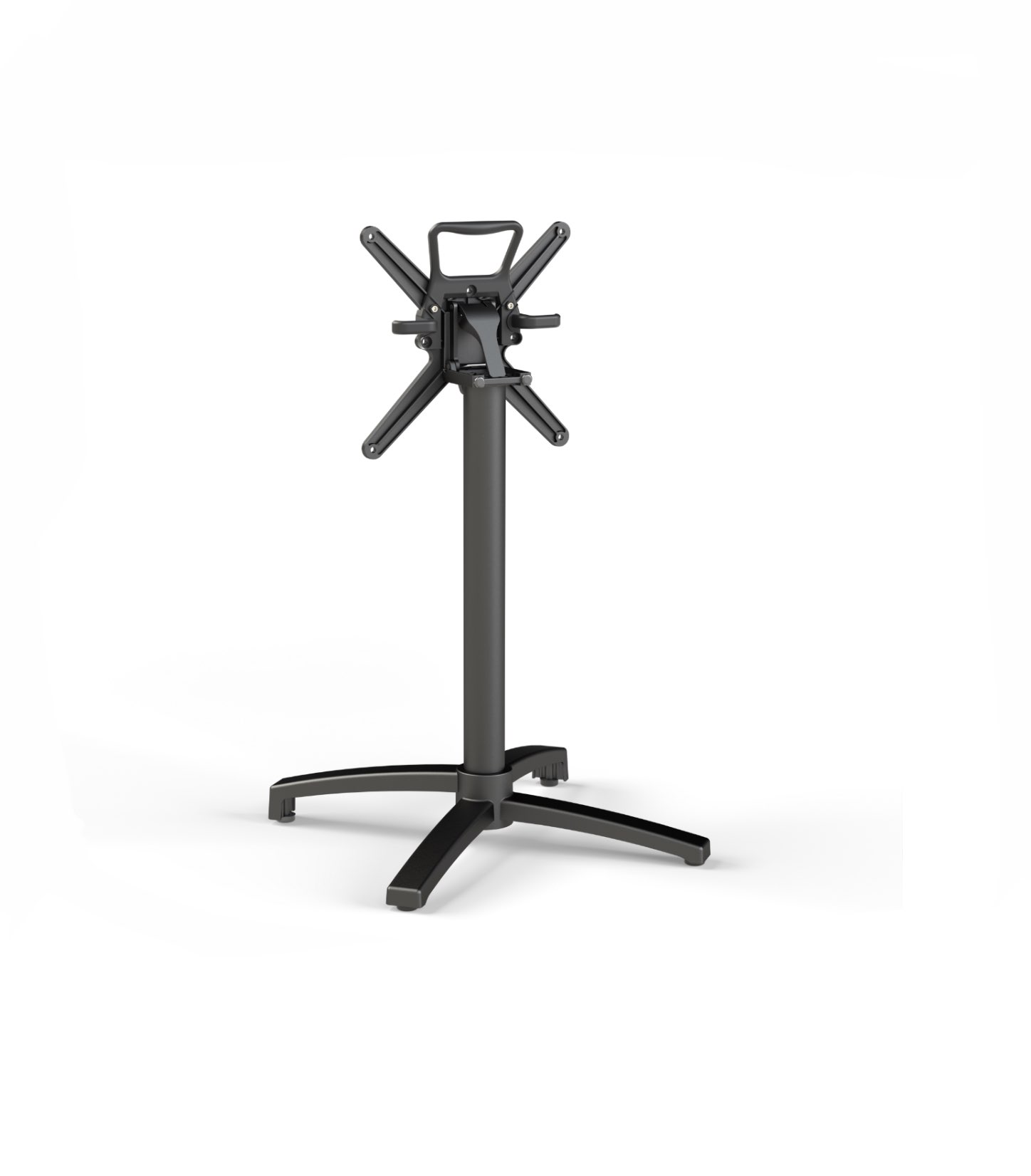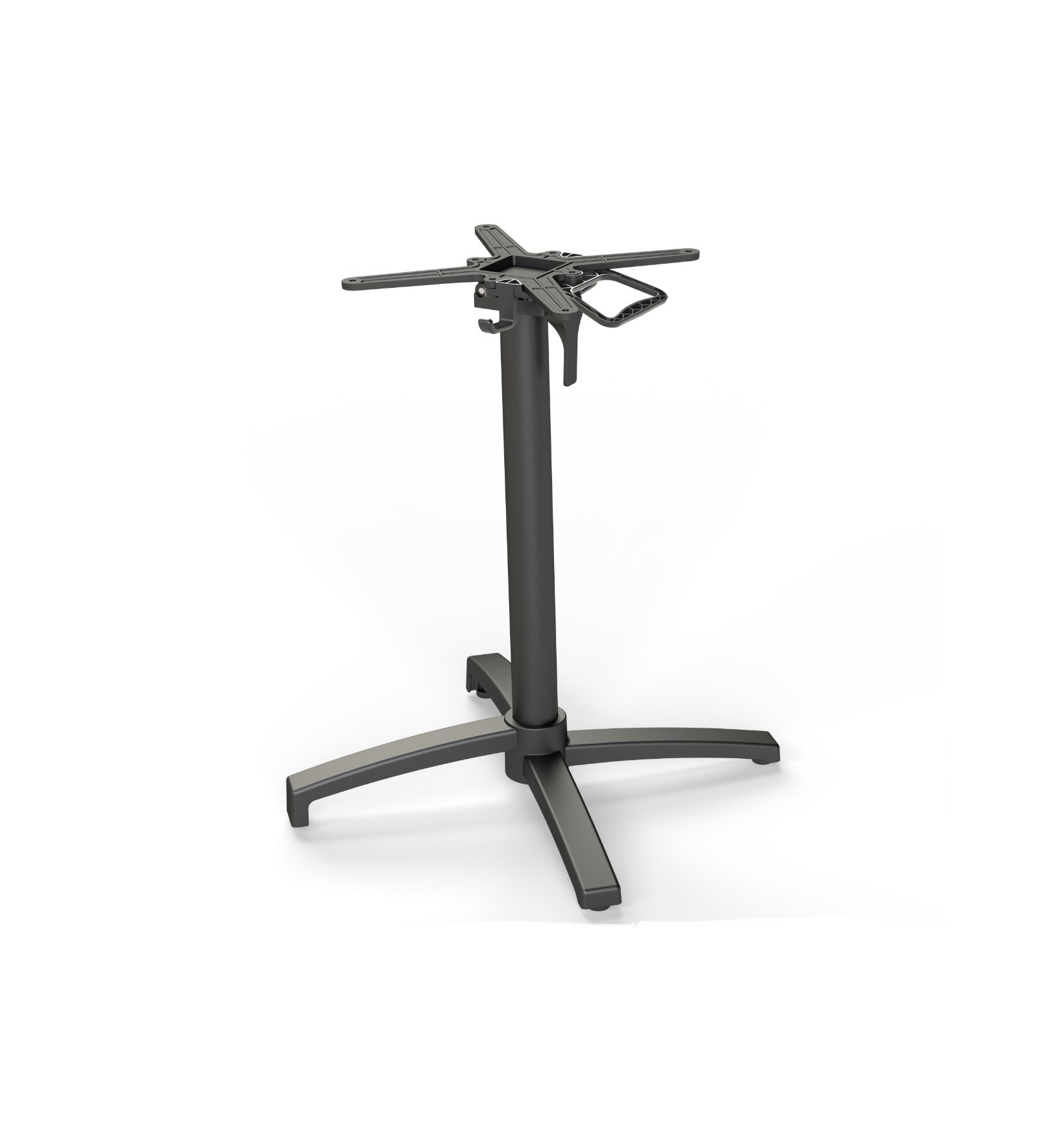 Base per tavoli in alluminio, per interno ed esterno, ribaltabile. Disponibile in finitura nero liscio con 4 piedini regolabili. Adatta per piani fino ad 80×80 cm.