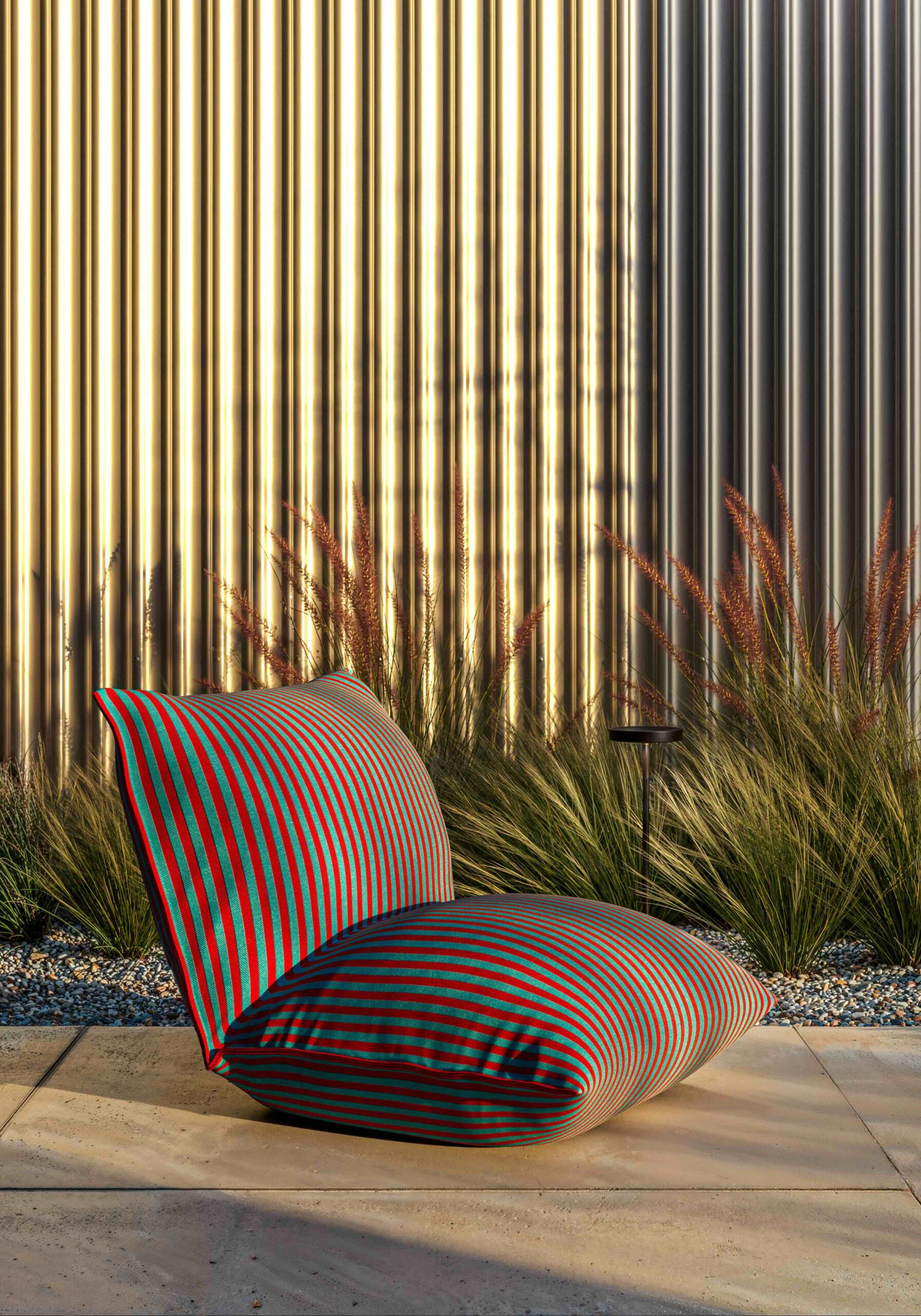 La collezione Brezza si arricchisce di un nuovo, inaspettato elemento: la poltrona imbottita Brezza Relax. Pensata per gli spazi outdoor, trae ispirazione dalla forma archetipica di due grandi cuscini che, accostati, creano una seduta con schienale dalla morfologia generosa e paffuta.