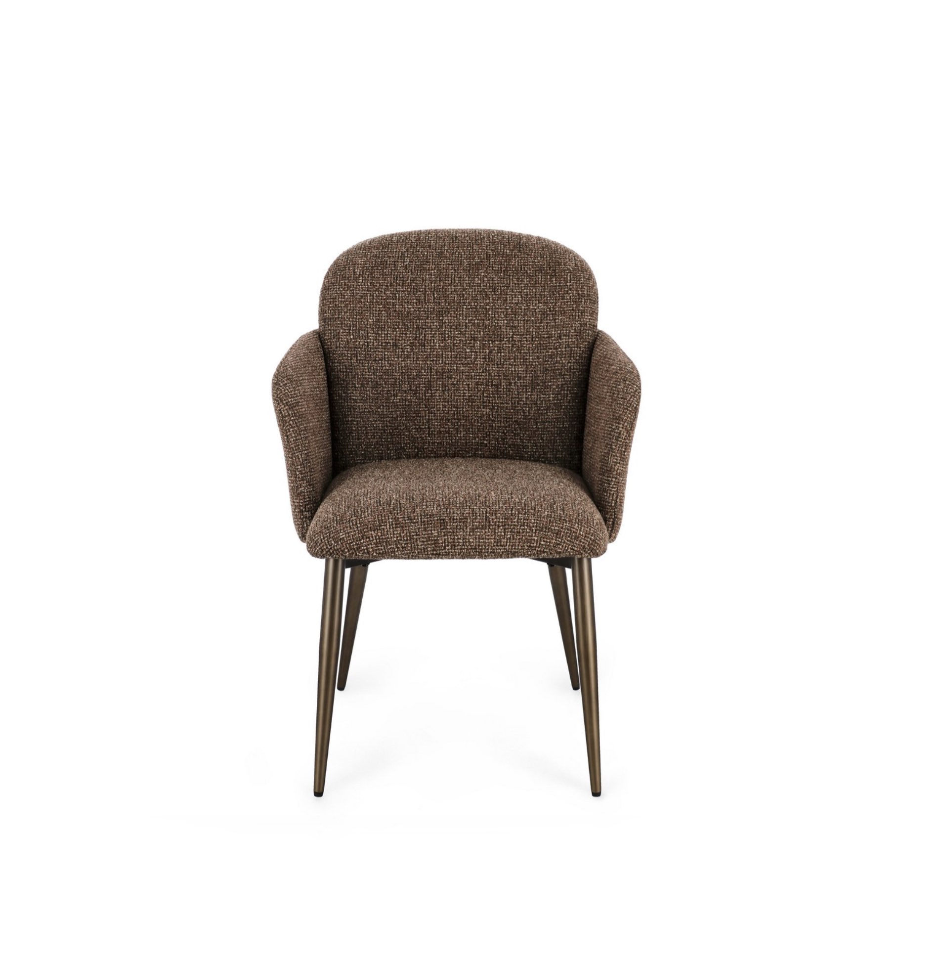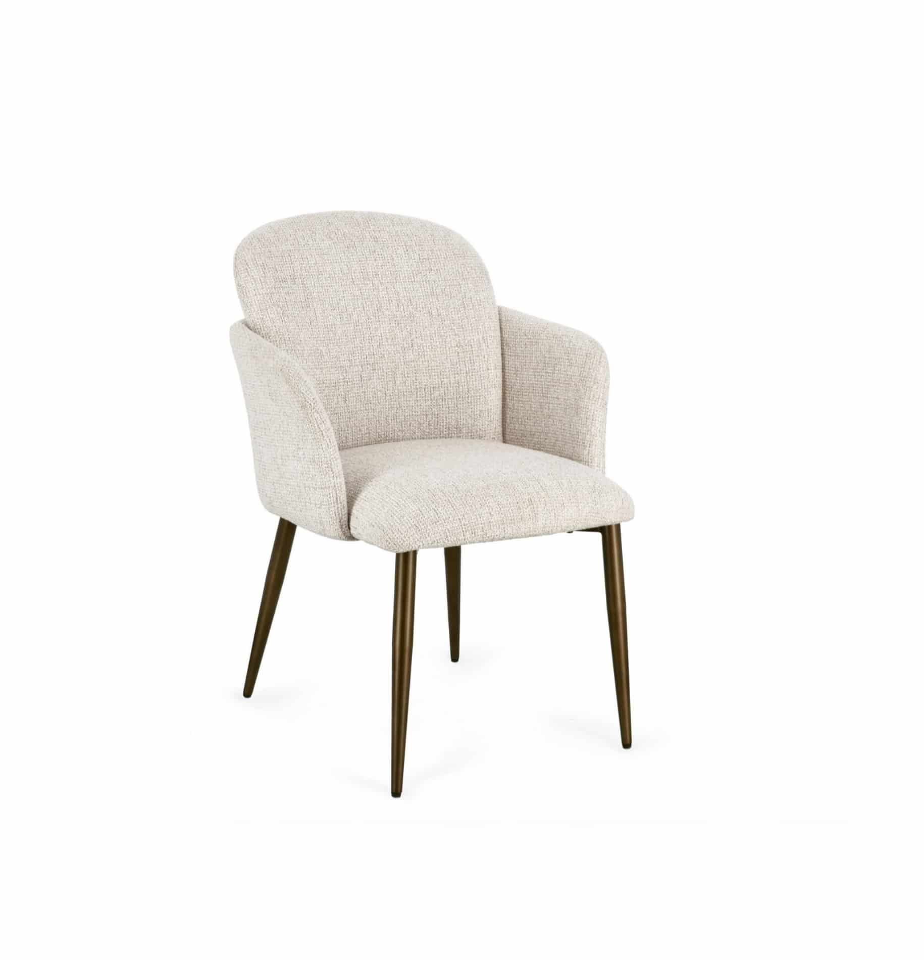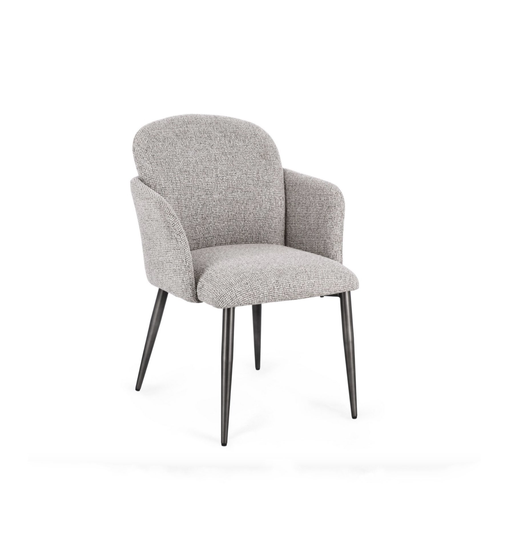 Poltroncina Ercilla, struttura in acciaio disponibile nella finitura effetto rame o argento scuro spazzolato, rivestimento in tessuto poliestere disponibile in vari colori.