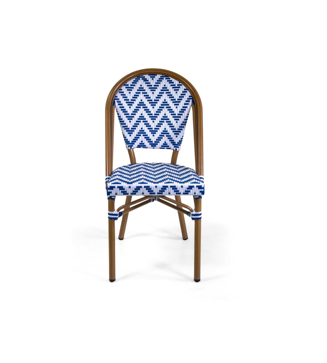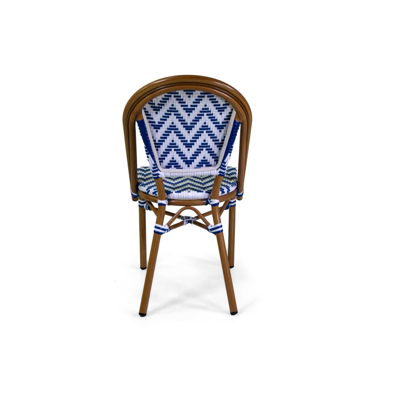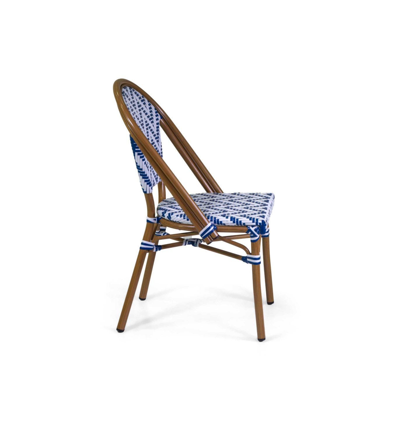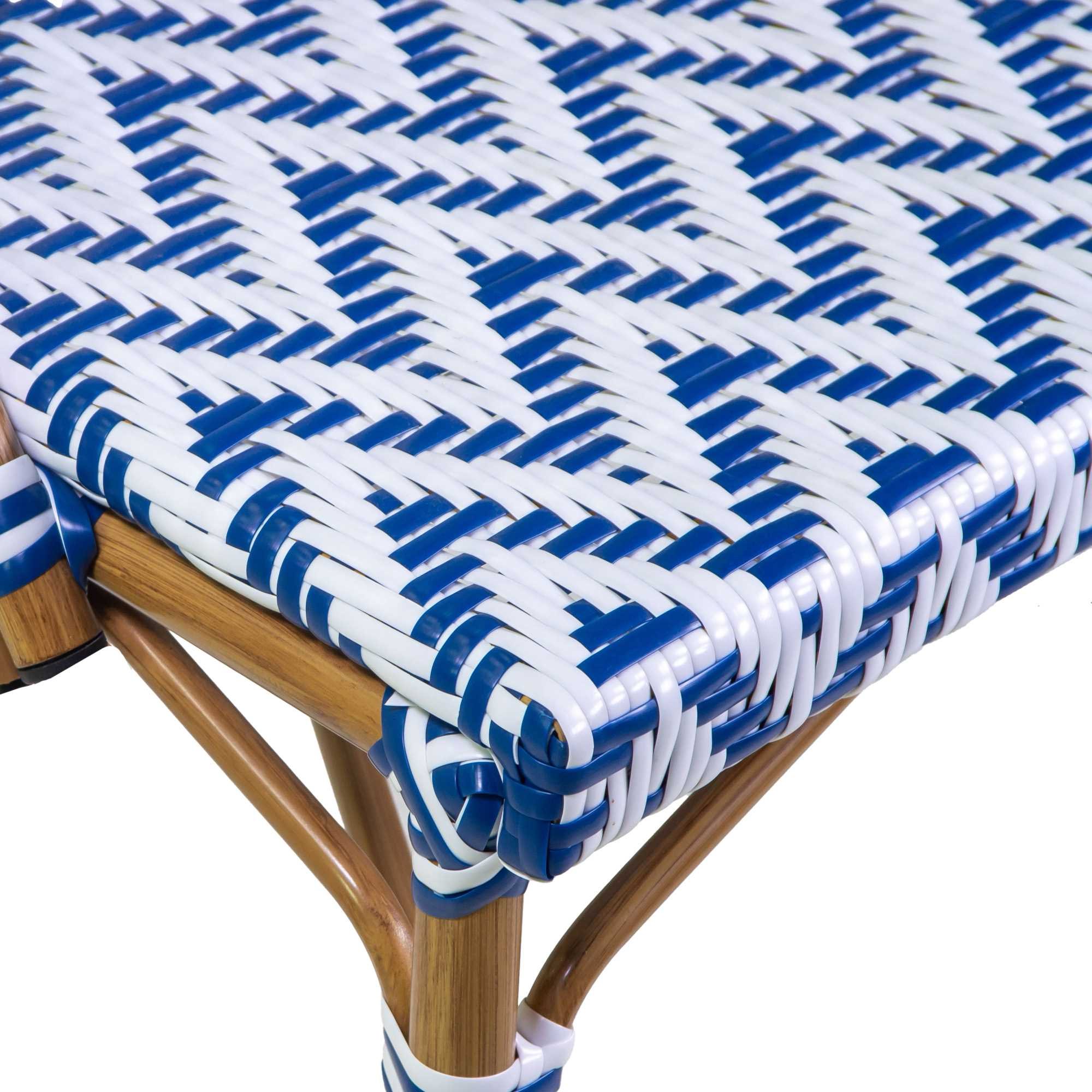 Sedia Manon in stile francese dalla struttura in alluminio e polyrattan bianco e blu, impilabile e adatta per l’arredamento esterno di bar e ristoranti.