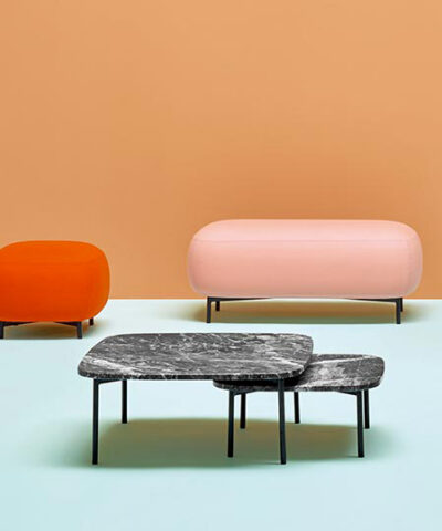 La collezione Hoodi è composta da tre tavolini dalla forma a mezzaluna, con dimensioni e altezze diversi.