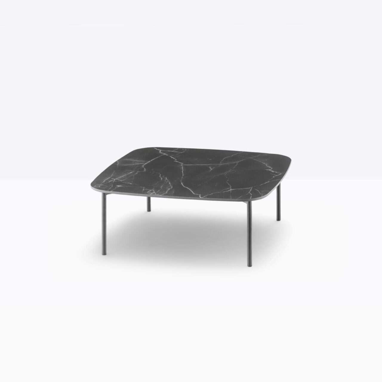 Tavolino Hoodi con gambe in metallo verniciato. Piano disponibile in metallo o rivestito in cuoio.