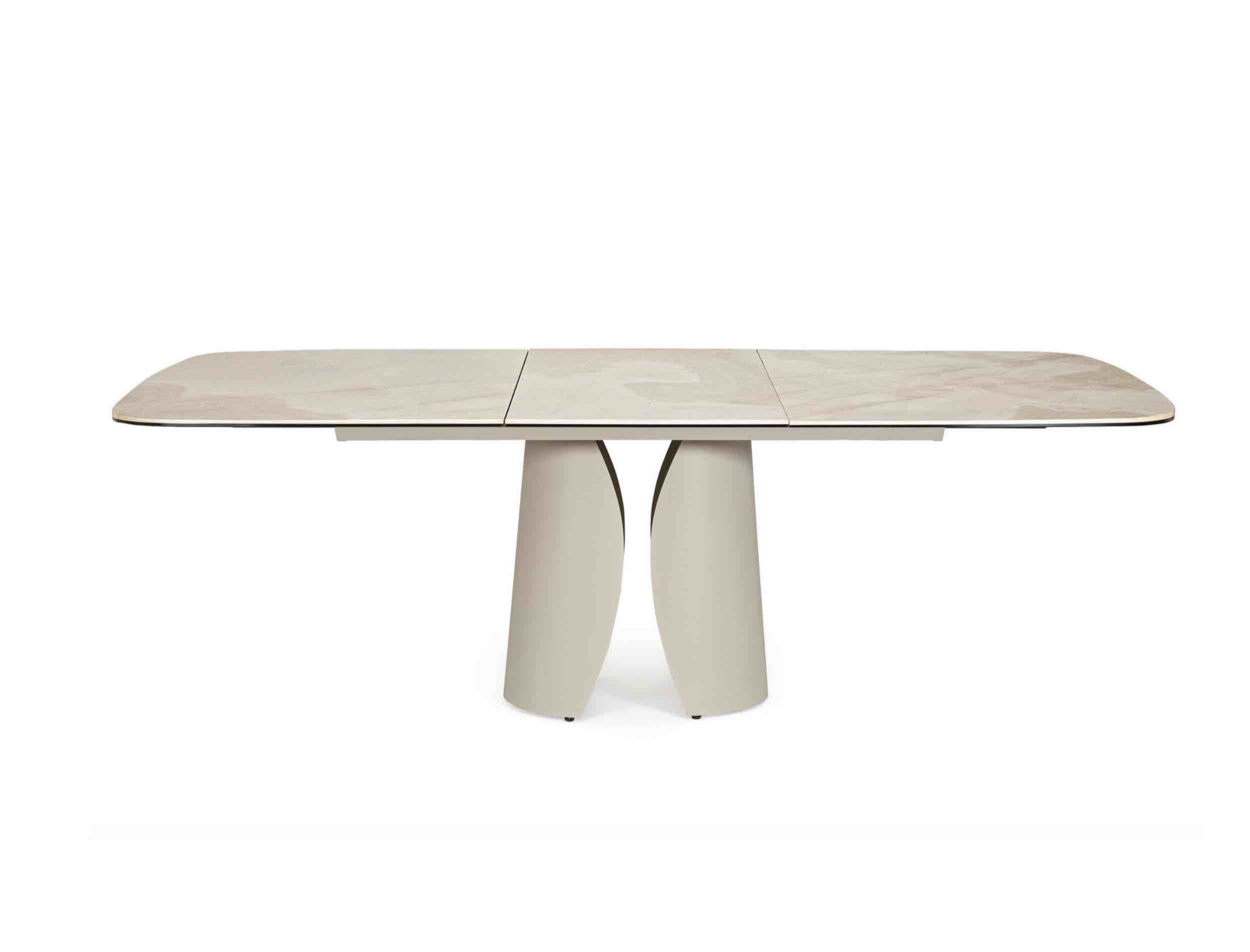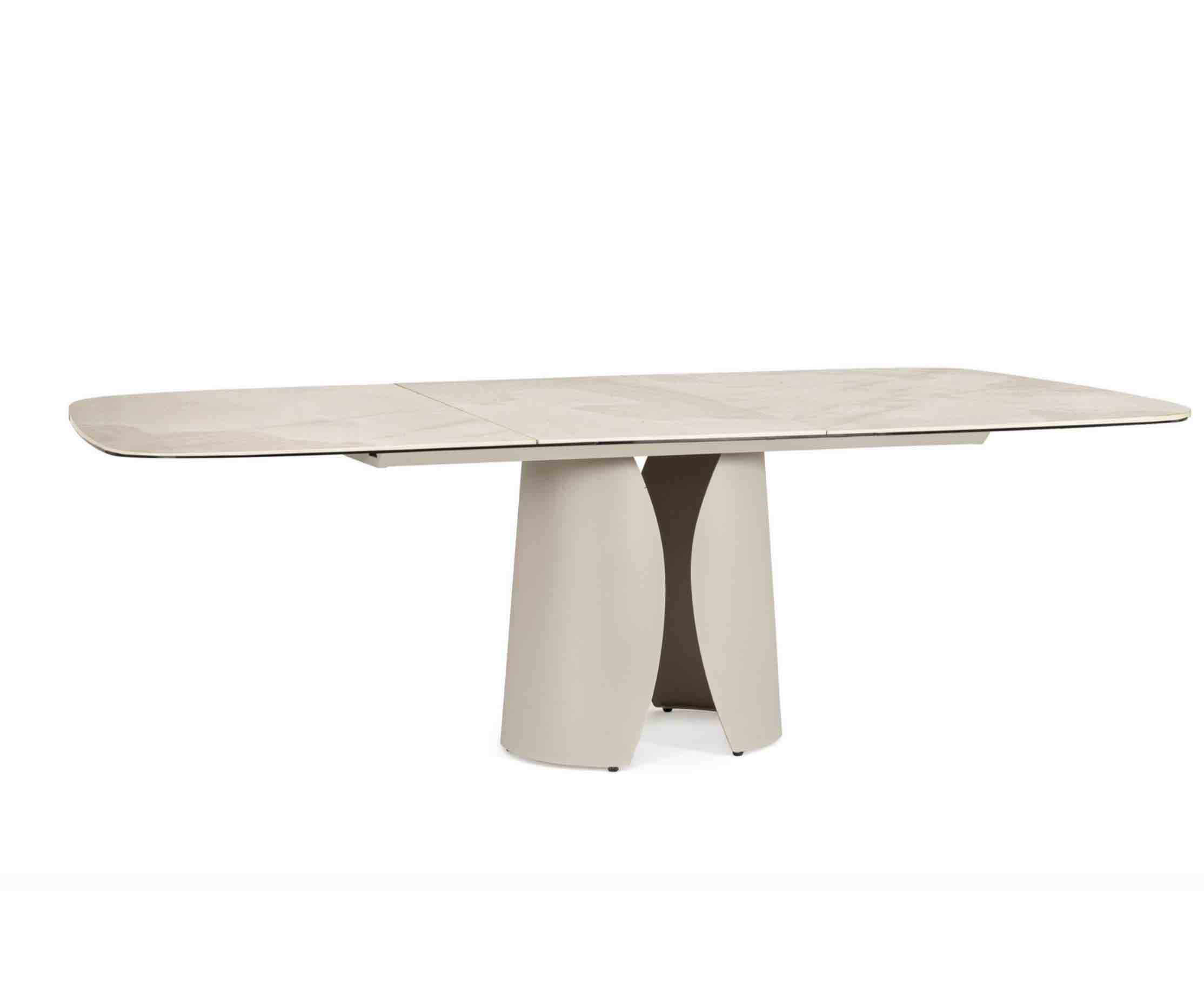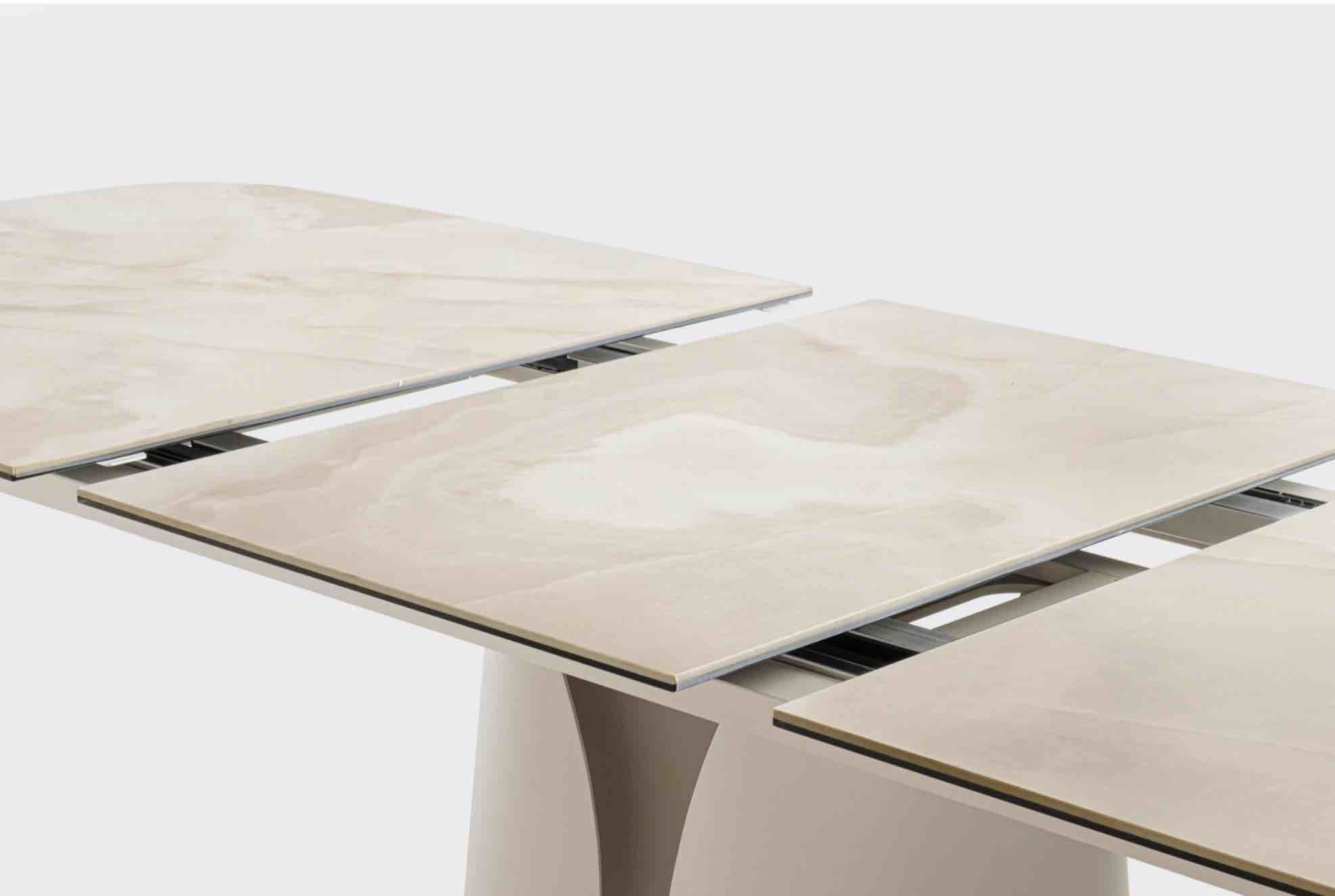 Tavolo Ardis piano in ceramica effetto onice lucido e base in acciaio verniciato a polvere epossidica colore beige, misura cm 180/240×95.